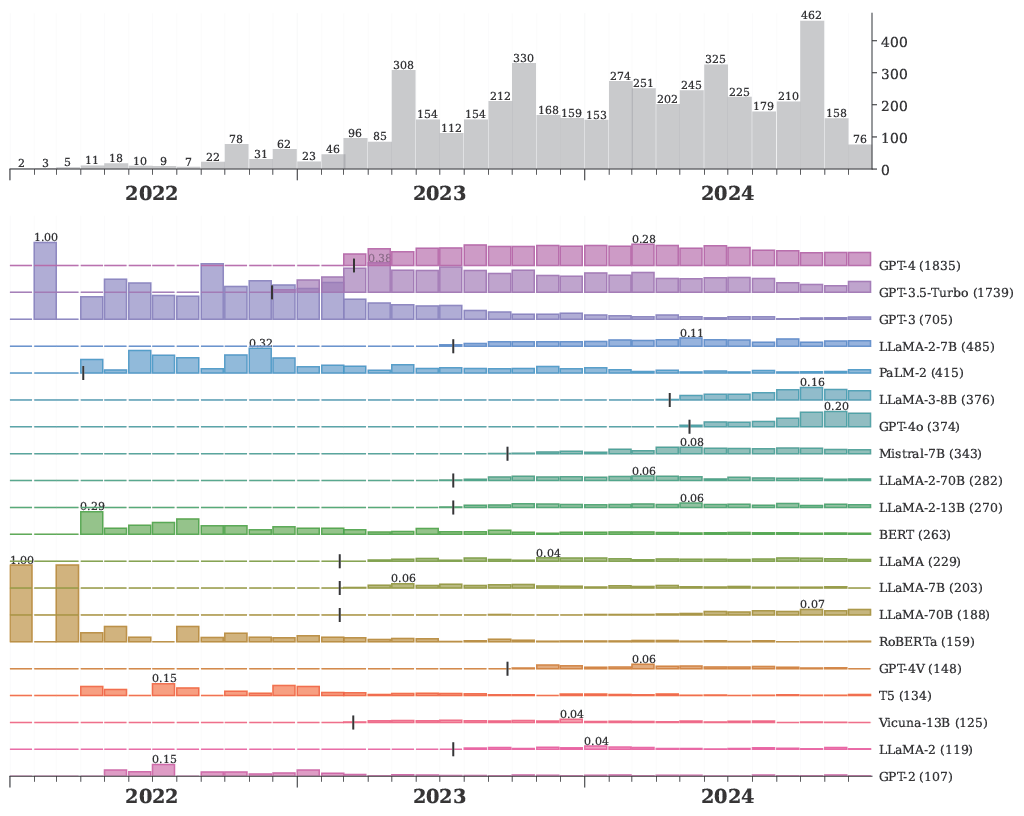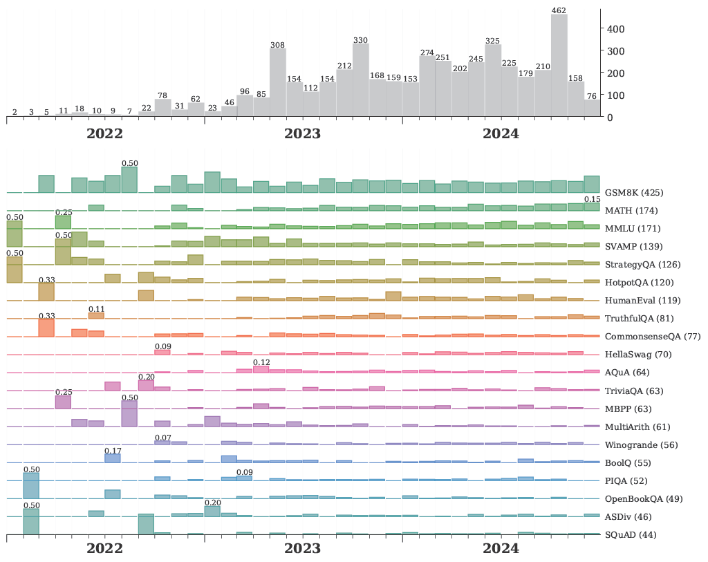 Mike also produced some nice graphs showing how the distrobution of benchmarks and models used in LLM reliability evaluations has changed over time.
