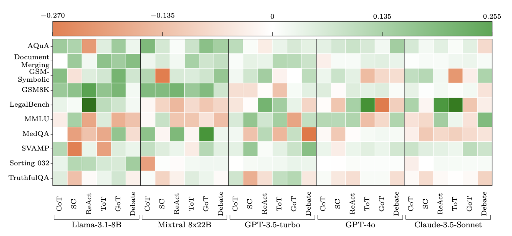 The heatmap shows the deviation from baseline accuracy for Chain of Thought, Self-Consistency, ReAct, Tree of Thoughts, Graph of Thoughts, and LLM Multi-Agent Debate applied across different models and benchmarks. Positive deviations (in green) indicate improvements over the unaided model (baseline), while negative deviations (in red) indicate performance decline: